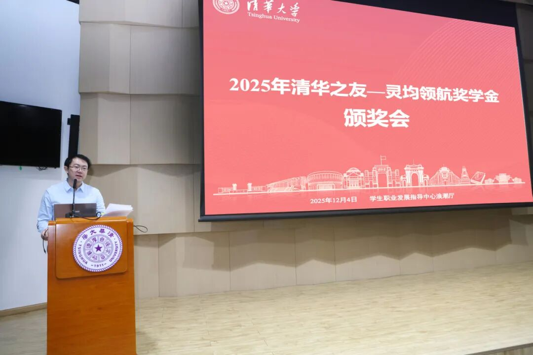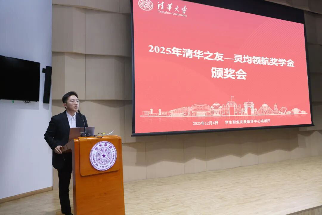 2025年12月4日,“清华之友——灵均领航奖学金”颁奖会在清华大学学生职业发展指导中心浪潮厅举行。灵均投资首席投资官马志宇、技术总监刘啸冰,清华大学研工部副部长廉威、教育基金会副秘书长计经纬等出席,来自交叉信息学院、金融学院、电子系等院系老师以及2025年度奖学金获得者参加活动。